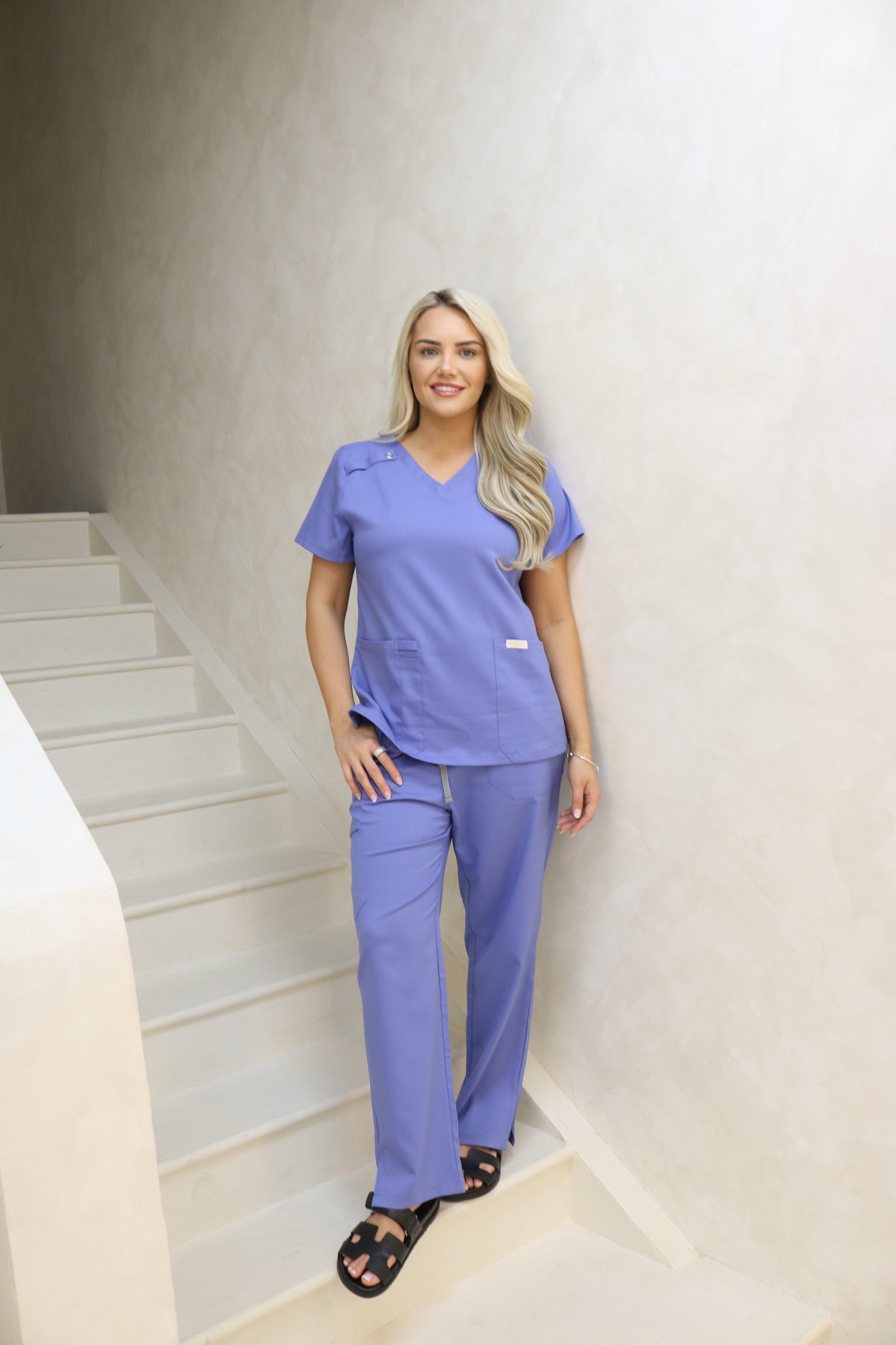 Timeless, functional, and flattering—our Classic Scrub Set is designed for professionals who appreciate a polished look with reliable comfort. This essential set features a relaxed-fit scrub top paired with stylish flared leg pants, offering a sleek silhouette without sacrificing mobility.